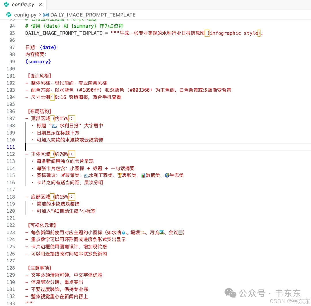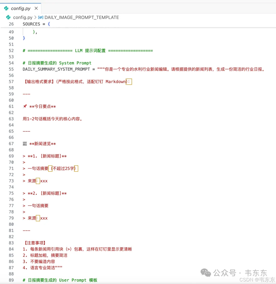 关于 LLM 日报生成,也有一些 Prompt 优化的经验。钉钉的 Markdown 渲染能力比较有限,如果不针对性优化,LLM 输出的内容会标题和正文挤在一起、列表项没有视觉分隔、整体看起来像一大段文字。优化后的 Prompt 要点是每条新闻用引用块包裹、标题加粗、用分隔线区分不同部分、适当添加 emoji 增加可读性。