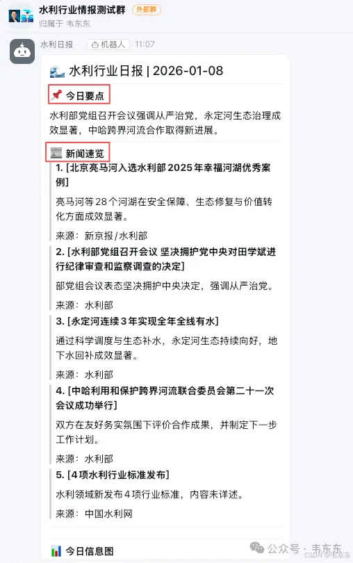 这个项目里组合使用了两种方式:采集完成后通过工作通知推给运营负责人(私信更容易引起注意),日报生成后通过群机器人发送到群里(方便大家一起看)。