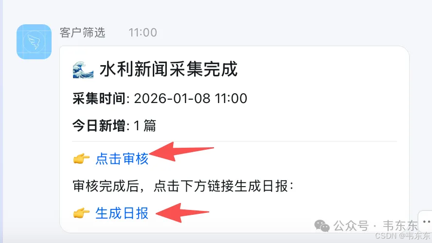 服务器部署之后,采集脚本由 crontab 定时触发,每天早上自动运行。采集完成后钉钉会推送一条消息,里面带着审核链接和生成日报的链接。对方在手机上收到通知,点击链接可以直接打开 NocoDB 进行审核,审核完再点击"生成日报"链接触发 FastAPI 端点。整个过程不需要登录服务器。