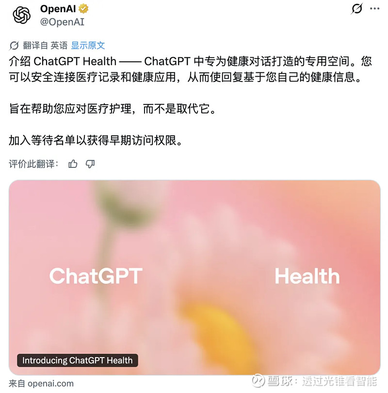 OpenAI方面表示,ChatGPT Health目前还只向⼀⼩部分早期⽤户开放。