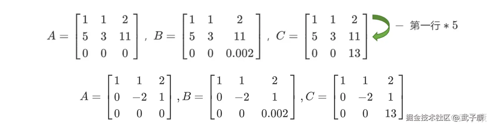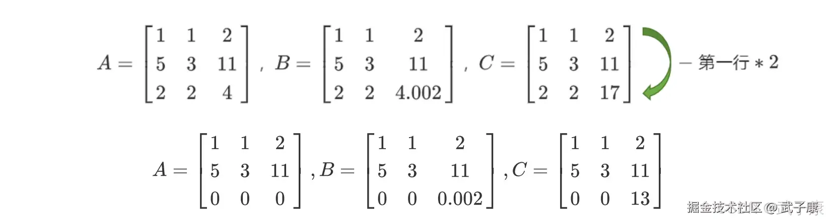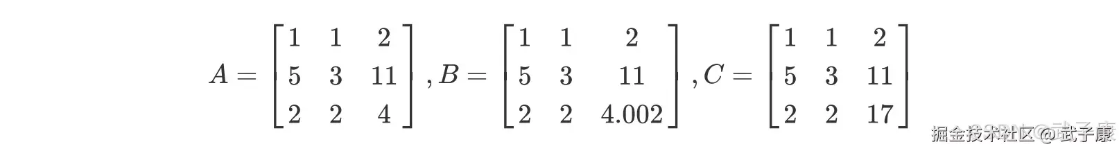 如此就转换成了梯形矩阵,我们可以看到,矩阵 A 明显不是满秩的,它有全零行所以行列式会为 0,而矩阵 B 和 C 没有全零行所以满秩。 而矩阵 A 和矩阵 B 的区别在于,A 中存在完全具有线性关系的两行(1,1,2 和 2,2,4),而 B 和 C 中则没有这样的两行。 而矩阵 B 虽然对角线上每个元素都不为 0,但具有非常接近于 0 的元素 0.02,而矩阵 C 的对角线上没有任何元素特别接近于 0。