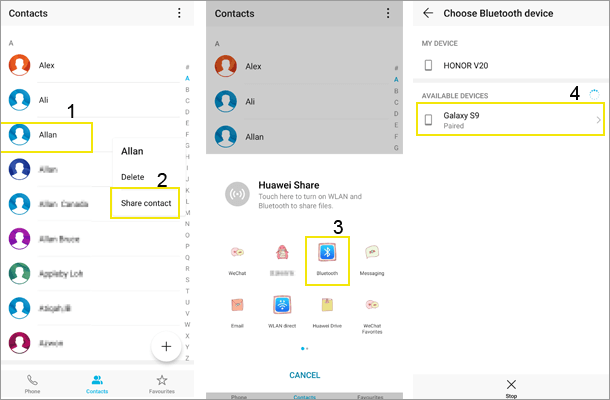 连接成功后,即可将 SIM 卡中的联系人传输到电脑。在Android上打开"通讯录"应用 > 选择要发送的联系人 > 点击**"分享"** > 选择**"蓝牙"** > 选择蓝牙设备,在本例中,点击您的Windows电脑名称。稍后,进度条会显示传输进度。传输完成后,您可以在电脑的蓝牙文件夹中找到这些联系人。