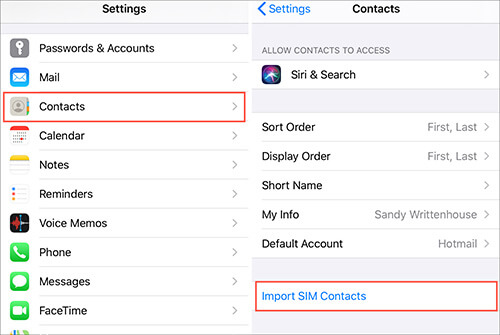 向下滚动选择**"联系人"** 选项,然后点击**"导入 SIM 卡联系人"**将联系人保存到 iPhone 内存中。