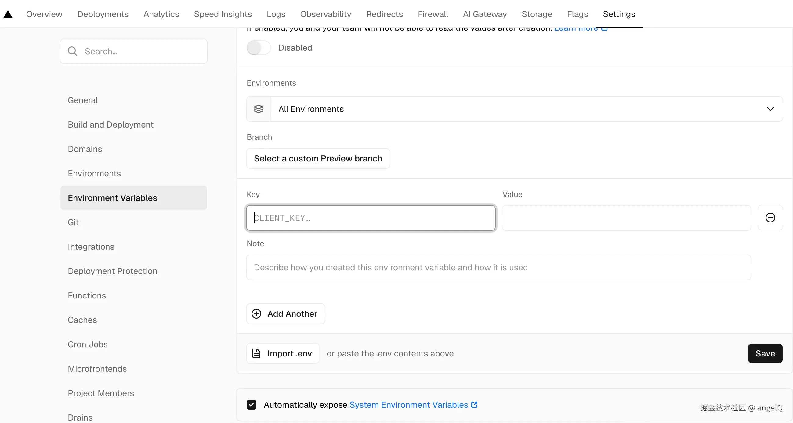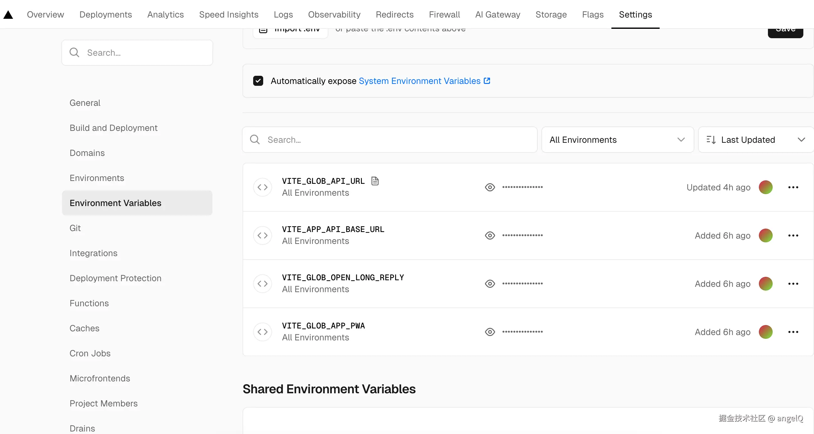 本地使用 .env 文件,代码中使用 dotenv 库进行注入,在代码中直接使用process.env.Variables 进行使用,这些变量需要配置在 Vercel 的 Environment Variables 中。