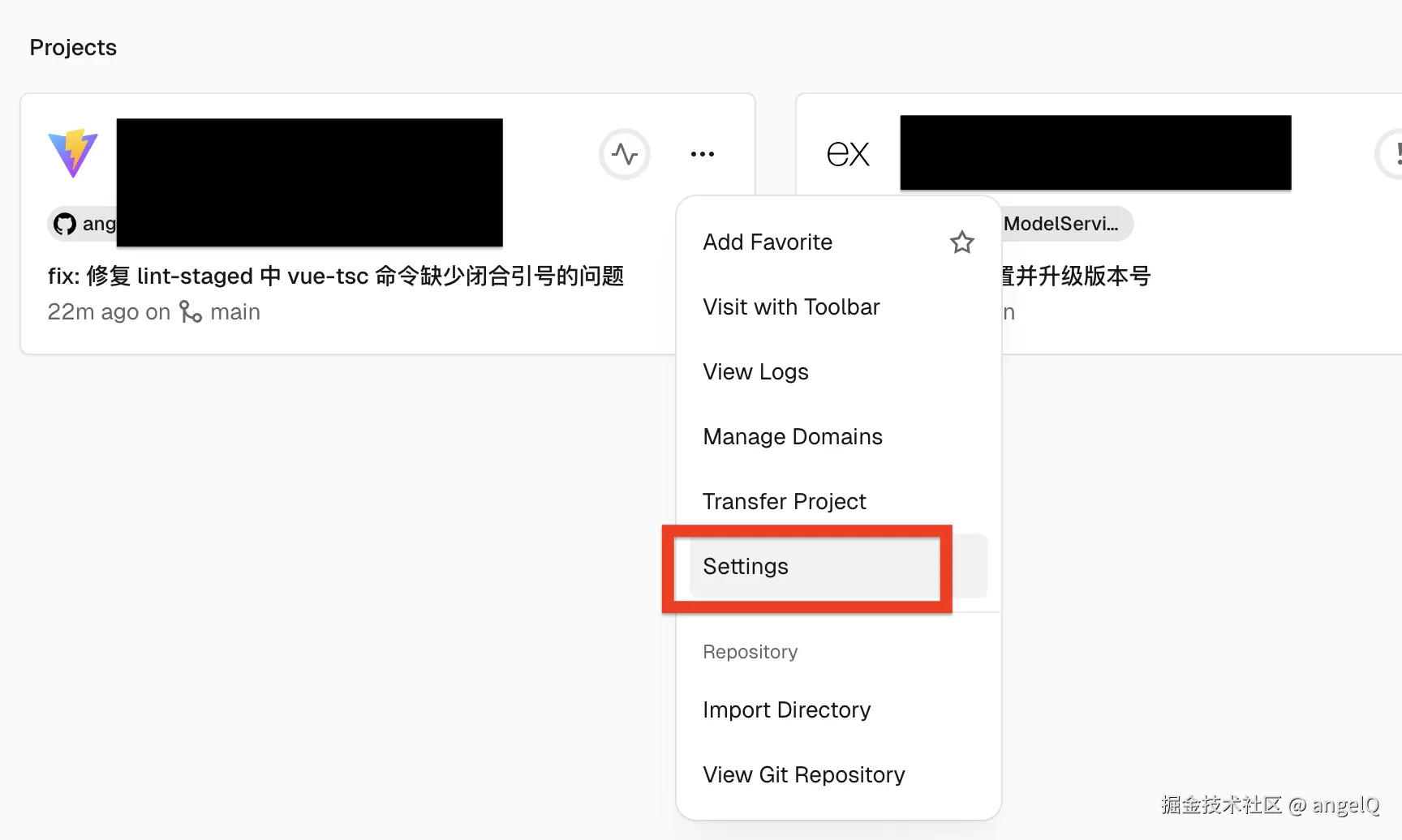 在 Vercel 的 Overview 主页面中,鼠标点击三个点进行配置部署好的项目,点击 Settings 进入项目配置。