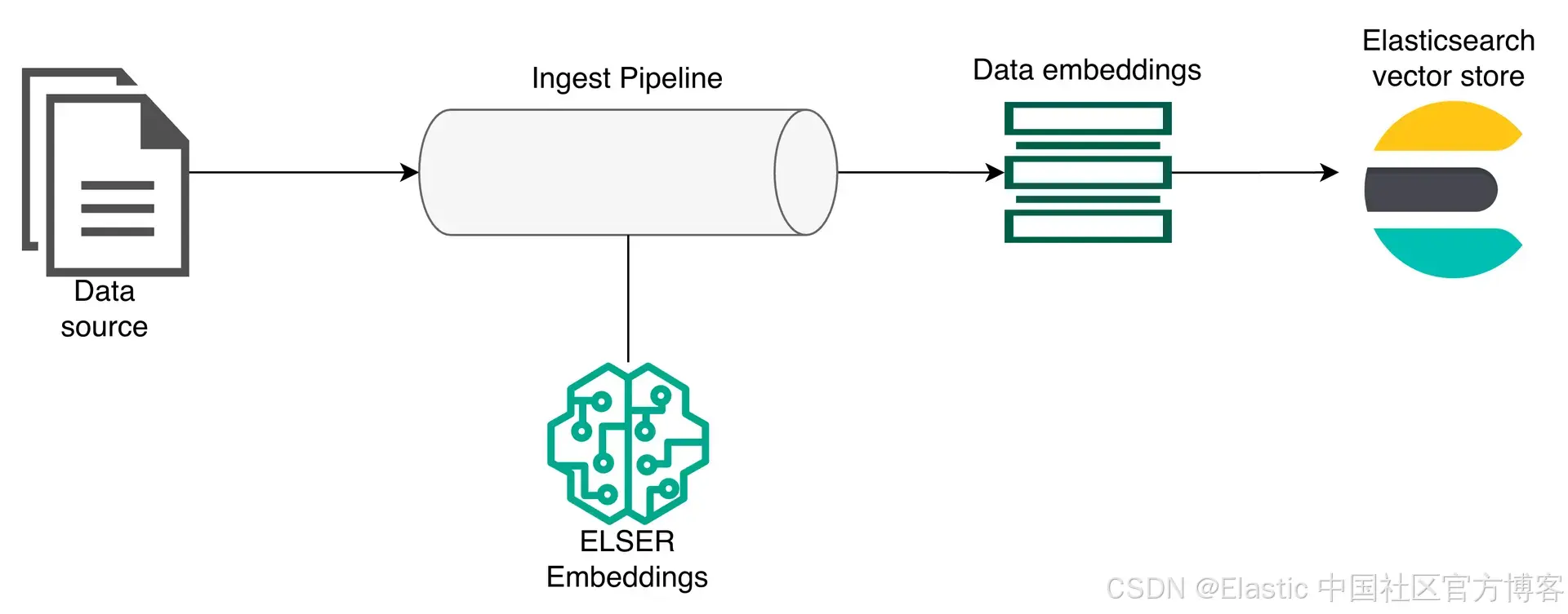 这里,第一个元素是将要存储在 Elasticsearch 中的数据。数据会经过一个 ingest pipeline ,在该过程中由 Elasticsearch ELSER 模型进行处理以生成 embeddings ,然后存储到 Elasticsearch 中。