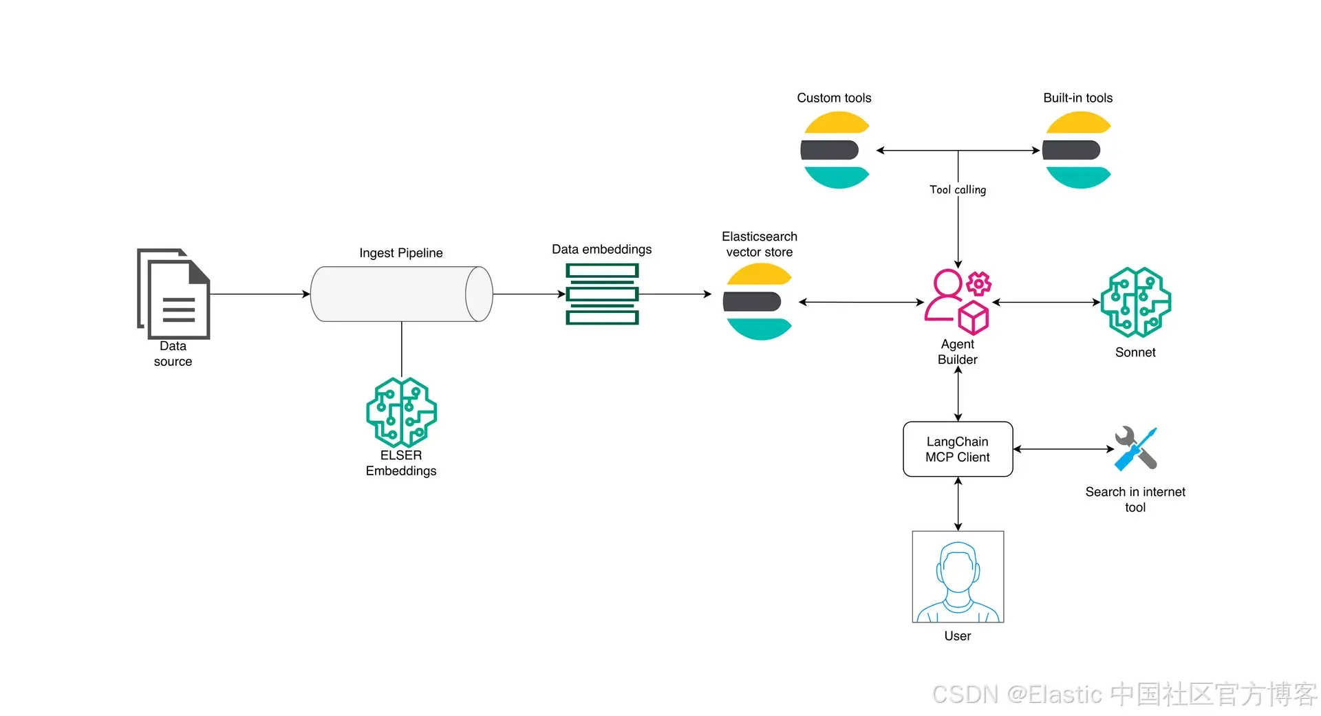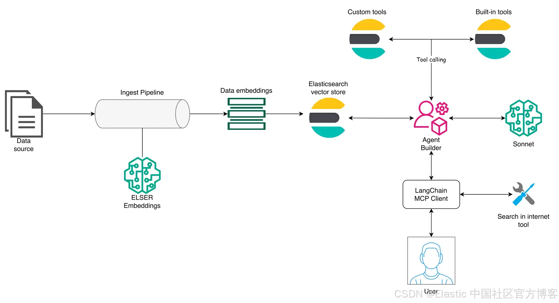 Elasticsearch 位于该架构的中心,作为 vector store ,提供 embeddings 生成模型,并同时提供 MCP server ,以便通过 tools 访问数据。为了更好地解释整个工作流,我们将分别来看 ingestion 层和 Agent Builder 层。