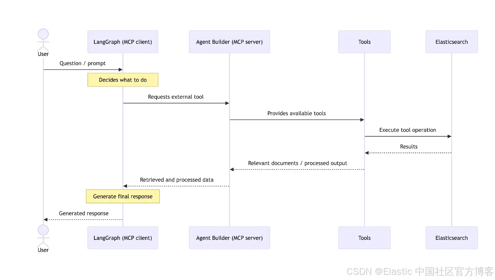 在这一层,Agent Builder 起核心作用,通过暴露与 Elasticsearch 数据交互所需的 tools 来管理在 Elasticsearch indices 上运行的工具,并将它们提供给使用者。然后 LangChain 通过 MCP client 处理编排。