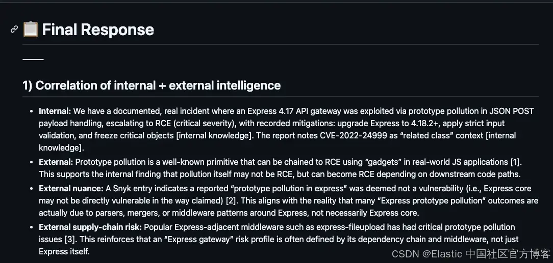 该响应清晰地关联了内部和互联网的发现,并提供了可操作的缓解步骤。它成功地突出了漏洞的严重性,并提供了结构化的、安全为导向的总结。