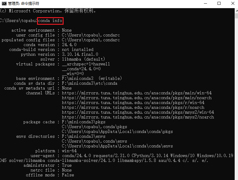 2.输入:conda info,回车,返回以下信息,说明Miniconda安装配置成功
