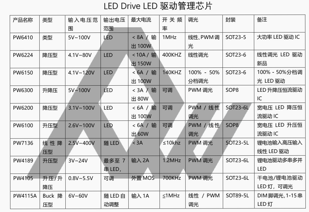 升压型 (Boost):PW6100、PW4189。适用于需要驱动更多LED串联(电压高于输入)的情况,或由锂电池直接供电的摩托车灯。
