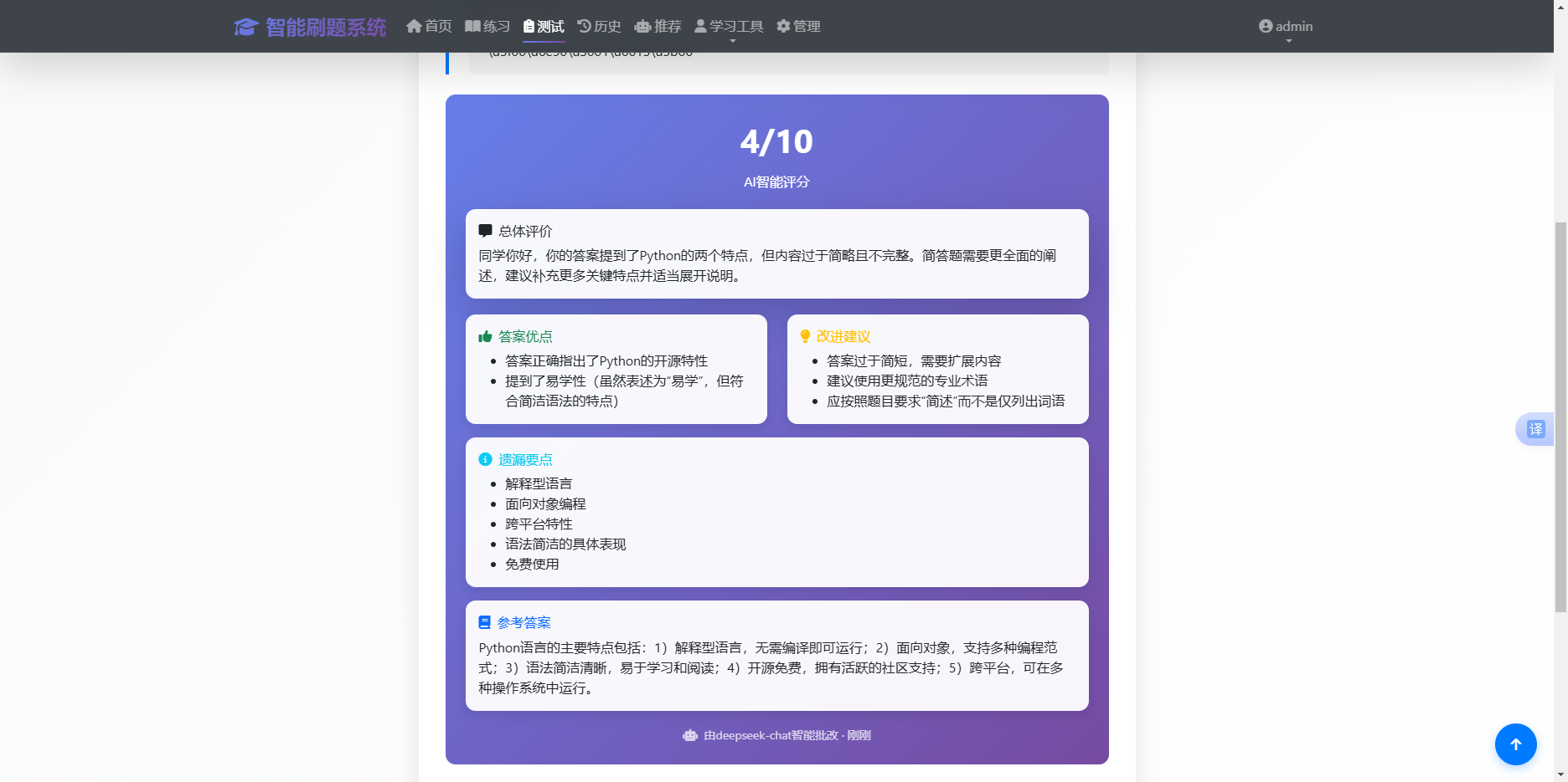 AI 智能批改功能利用 DeepSeek 大语言模型对用户的简答题进行自动评分和评析。系统能够理解用户的答案内容,对比标准答案的要点,给出合理的分数评价。更重要的是,AI 不仅评分,还会根据用户的回答提供个性化的评语和学习建议。对于答错的题目,AI 会指出错误原因并给出正确思路;对于答对的题目,AI 也会鼓励用户并延伸相关知识点。这种智能批改大大提高了学习反馈的及时性和针对性,让用户在练习中不断进步。