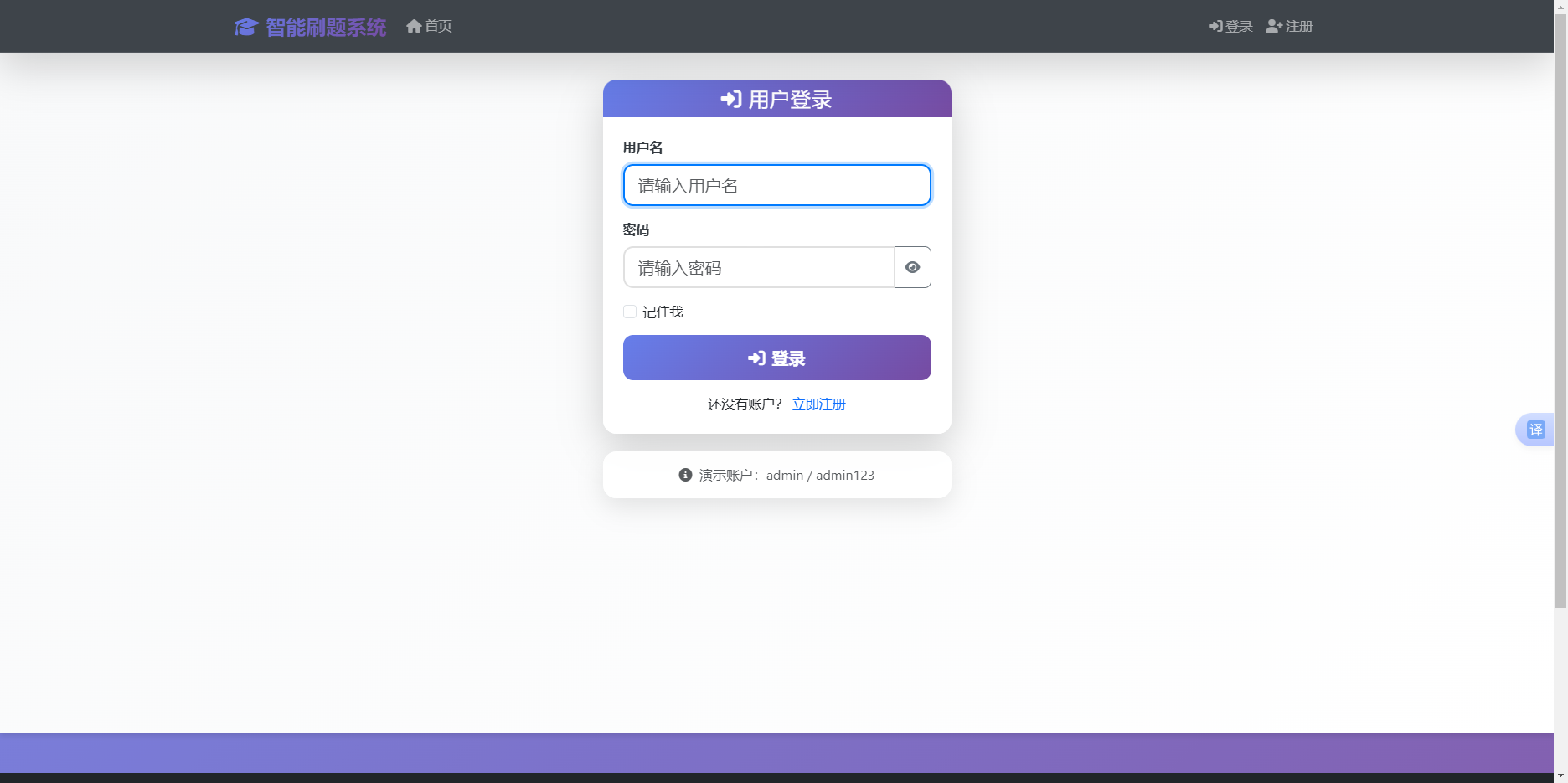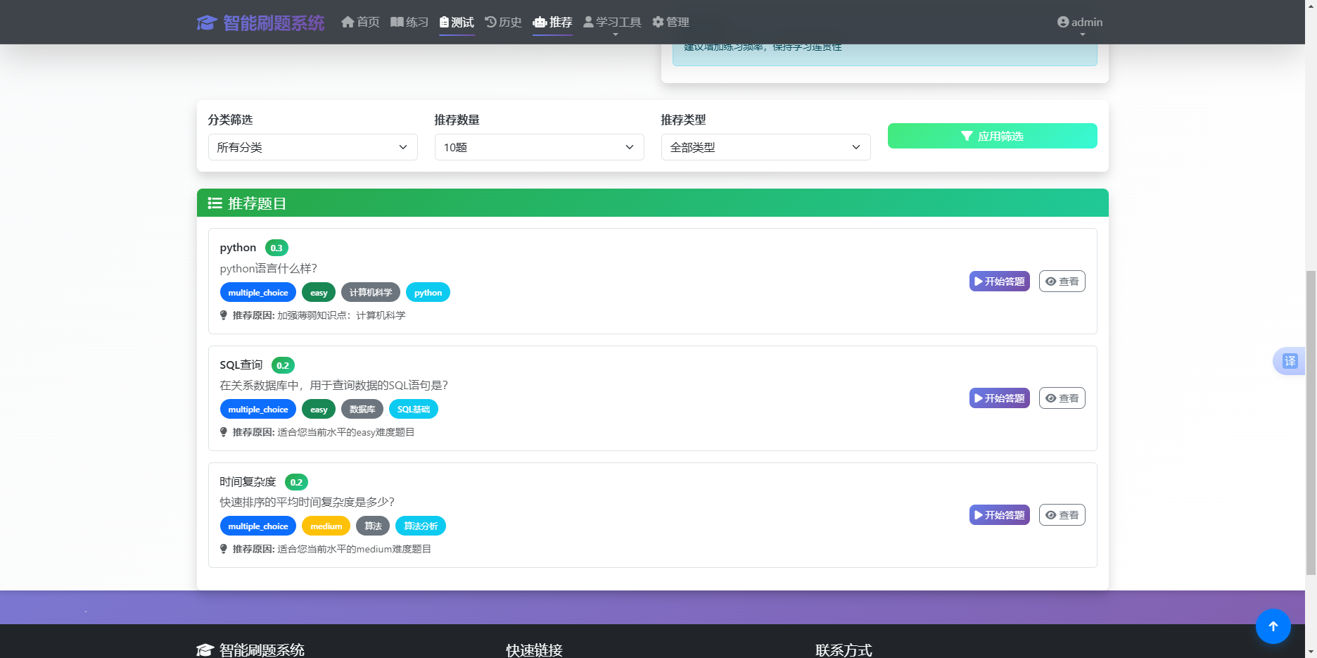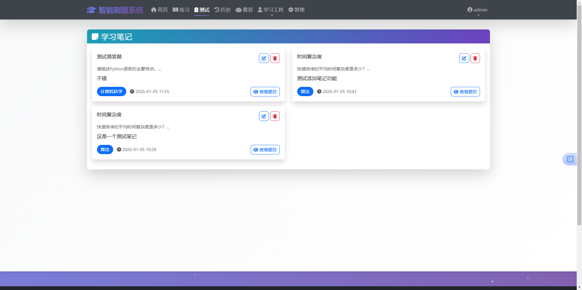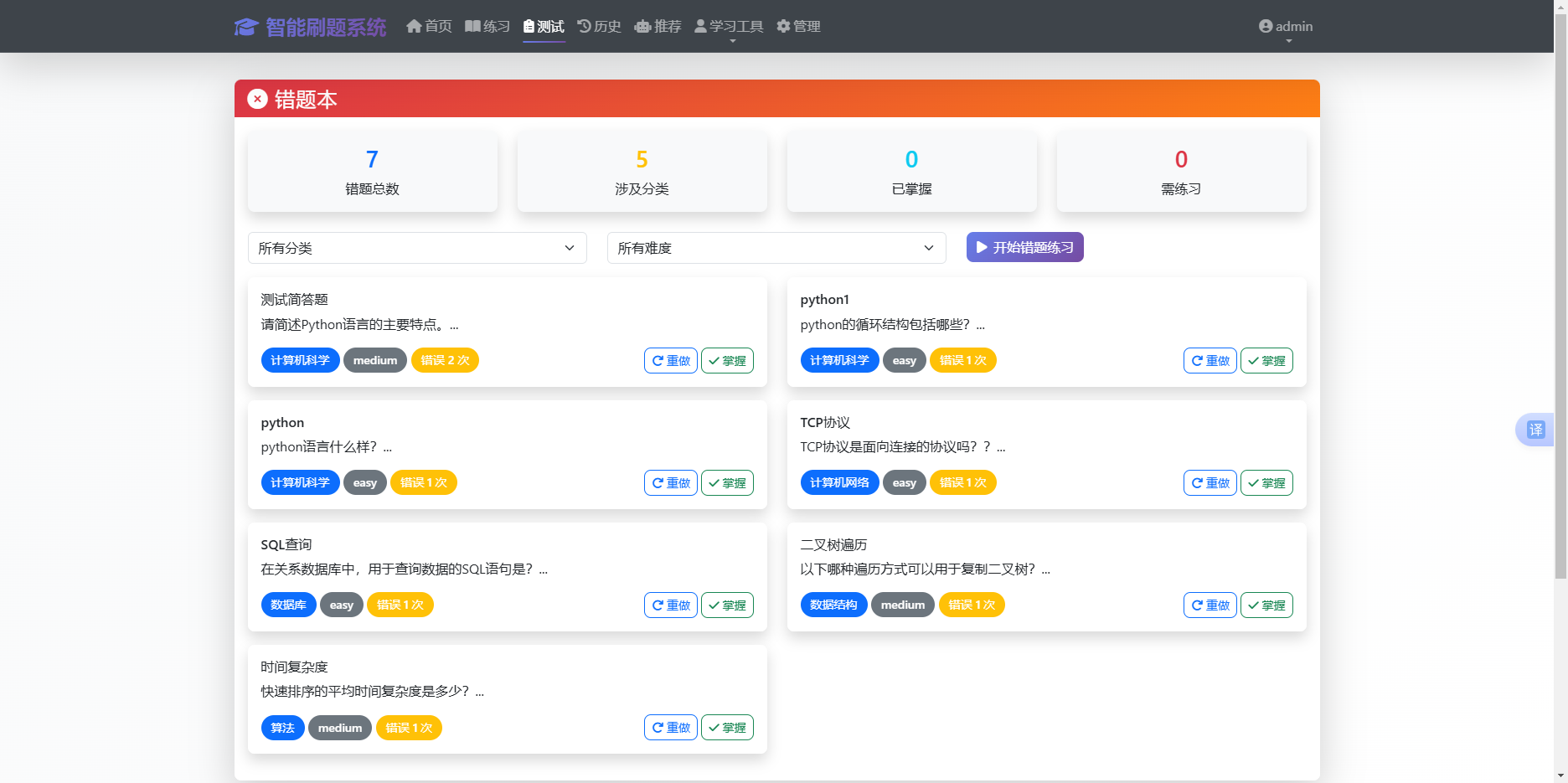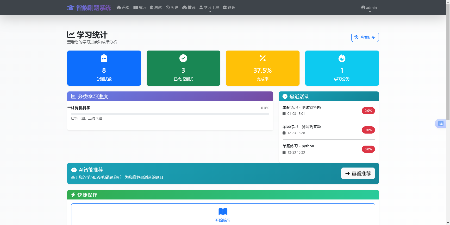智能刷题系统是一款基于 Flask 框架开发的在线学习平台,集成了人工智能技术为用户提供个性化的刷题体验。系统支持多种题型(选择题、判断题、简答题),提供分类练习、随机练习、智能推荐等多种学习模式。通过 DeepSeek AI 技术,系统能够自动批改简答题并提供详细解析,帮助用户快速提升学习效率。系统还包含错题本、收藏夹、学习笔记等辅助工具,以及完善的学习统计分析功能,让用户能够全面了解自己的学习进度和薄弱环节。管理员可以通过后台管理系统轻松管理题目、分类和用户数据。