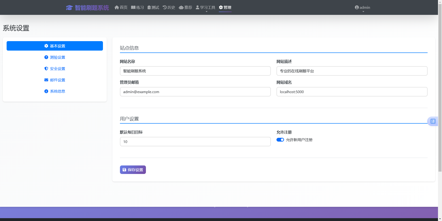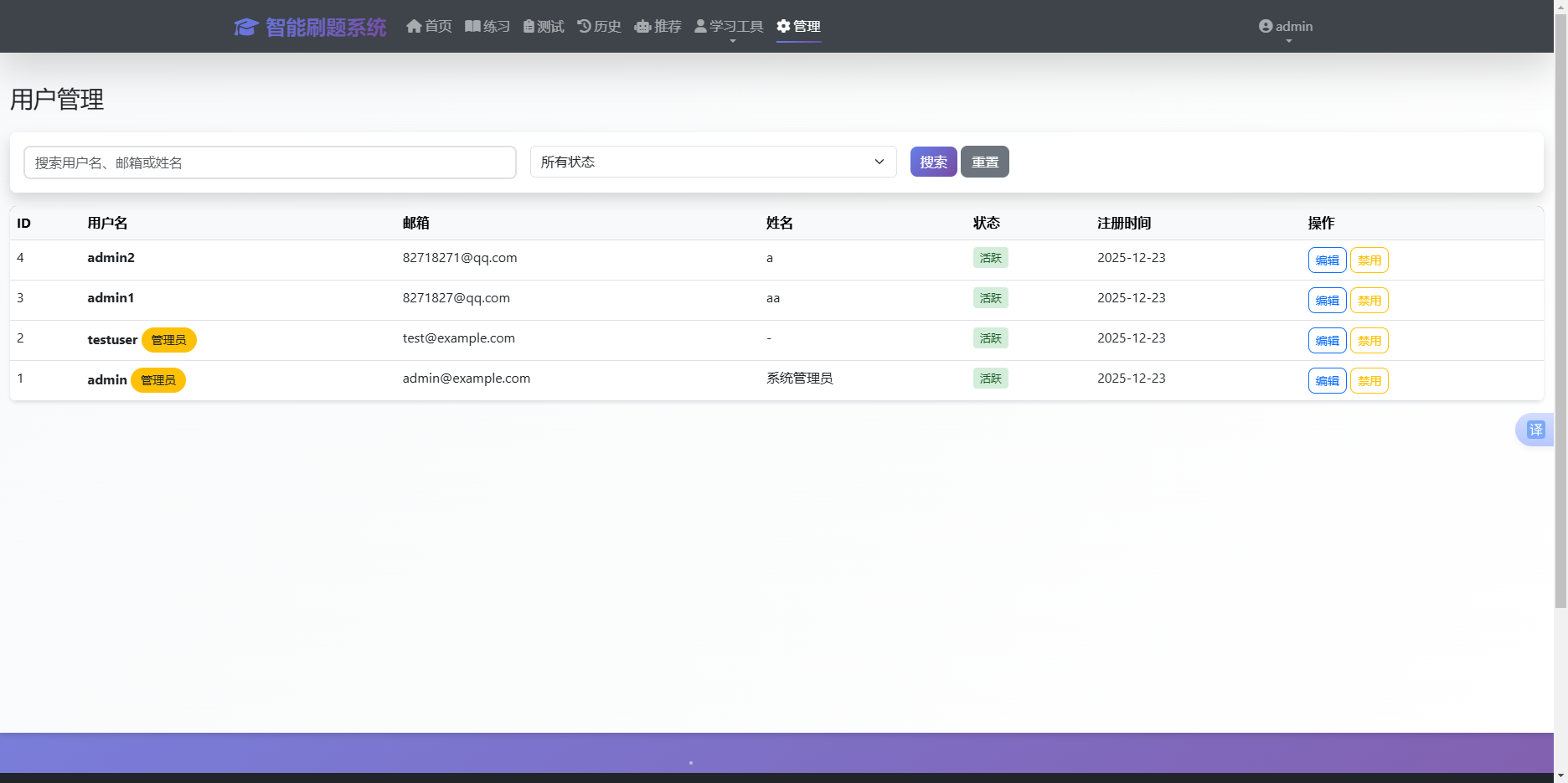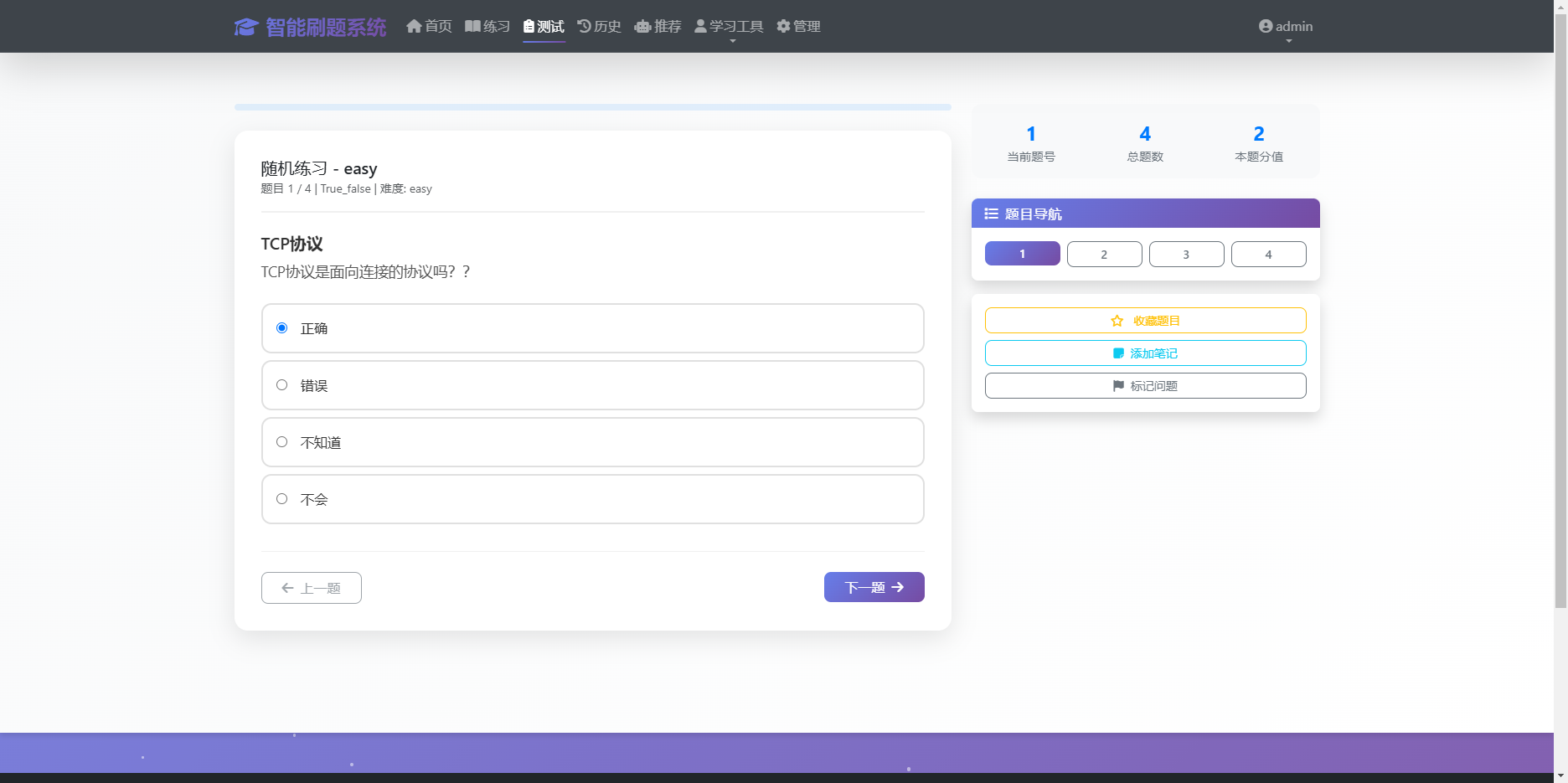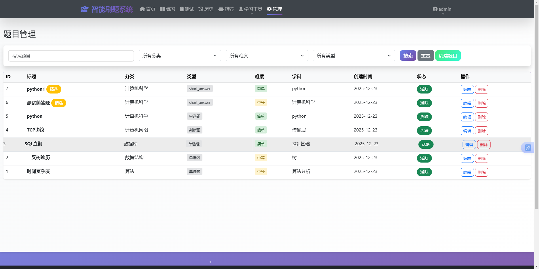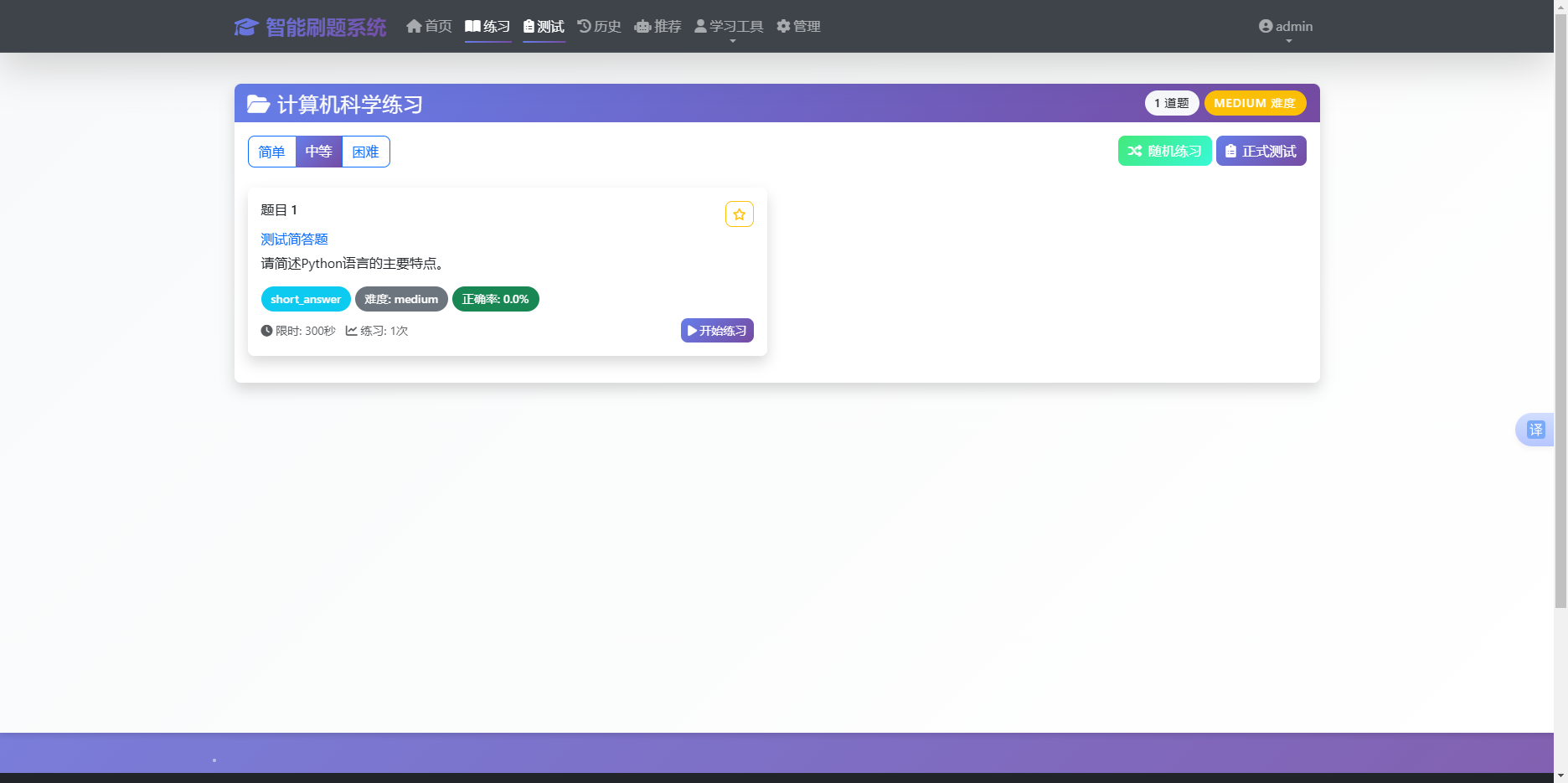 智能刷题系统是一款基于 Flask 框架开发的在线学习平台,集成了人工智能技术为用户提供个性化的刷题体验。系统支持多种题型(选择题、判断题、简答题),提供分类练习、随机练习、智能推荐等多种学习模式。通过 DeepSeek AI 技术,系统能够自动批改简答题并提供详细解析,帮助用户快速提升学习效率。系统还包含错题本、收藏夹、学习笔记等辅助工具,以及完善的学习统计分析功能,让用户能够全面了解自己的学习进度和薄弱环节。管理员可以通过后台管理系统轻松管理题目、分类和用户数据。