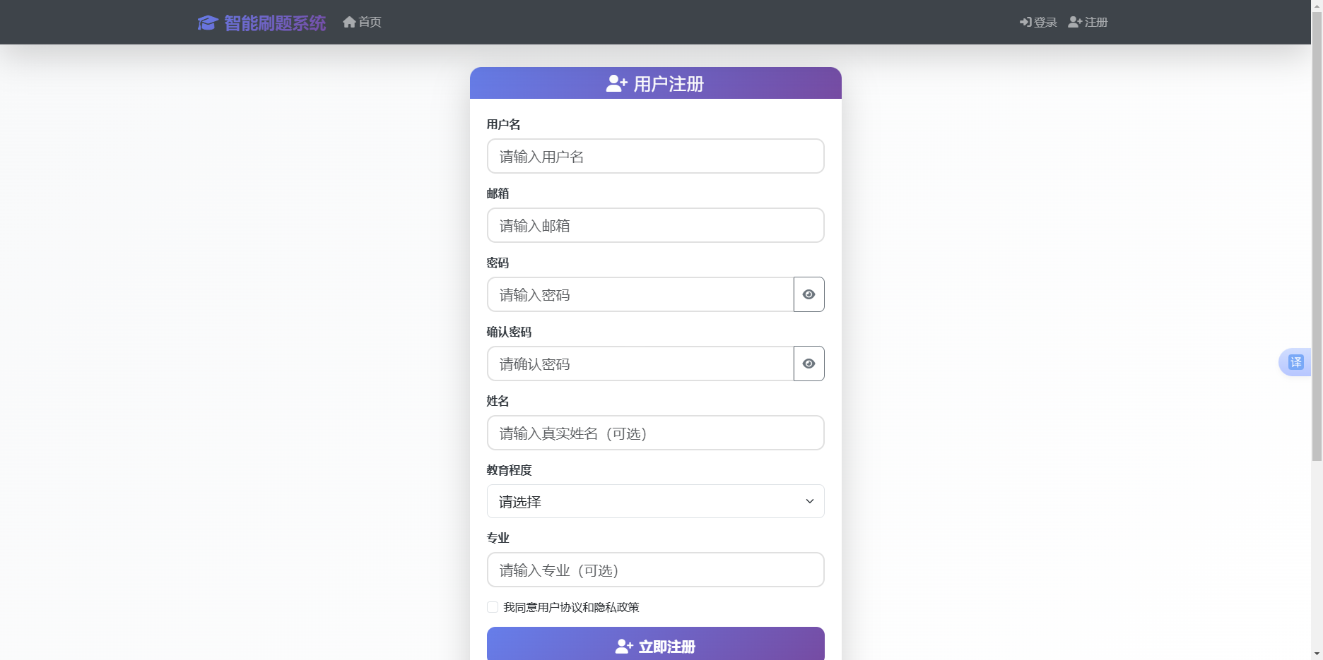 用户注册与登录功能支持新用户创建账户和老用户安全访问系统。用户在注册时需要填写用户名、邮箱、密码等基本信息,系统会对邮箱格式进行验证并确保用户名唯一性。密码采用 bcrypt 加密存储,保障用户数据安全。登录时系统会验证用户身份,支持"记住我"功能以便下次自动登录。对于忘记密码的用户,系统提供了密码找回功能。登录成功后,用户可以访问所有学习功能,并在个人中心管理自己的账户信息和安全设置。