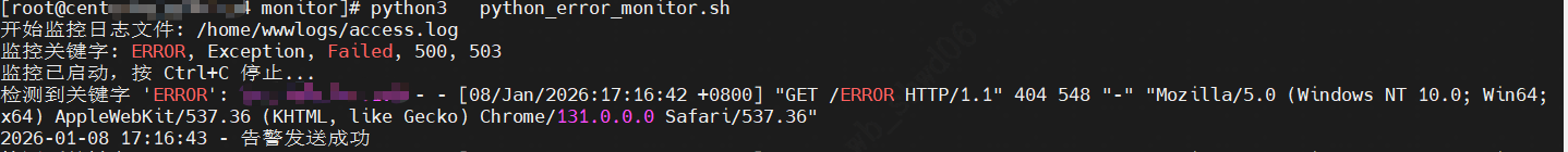 "keywords": ["ERROR", "Exception", "Failed", "500", "503"], # 监控的关键字