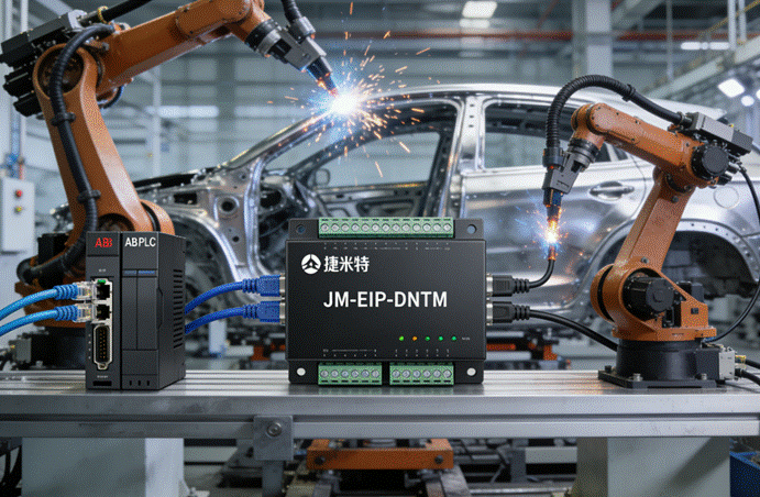 解决方案描述:在PLC机柜中部署一台捷米特 JM-EIP-DNTM协议转换网关。网关的Ethernet/IP端口接入现有工厂以太网,与AB PLC处于同一网络;其DeviceNet端口通过总线连接所有机器人。通过配置软件,将每个机器人的关键输入/输出数据点(如启动、停止、故障信号、当前位置寄存器等)一对一映射到PLC的特定数据标签中。PLC像访问本地设备一样,通过读写这些标签即可直接控制机器人并获取状态,实现了从"硬接线+人工"模式到"全数字通信+自动调度"模式的根本转变。