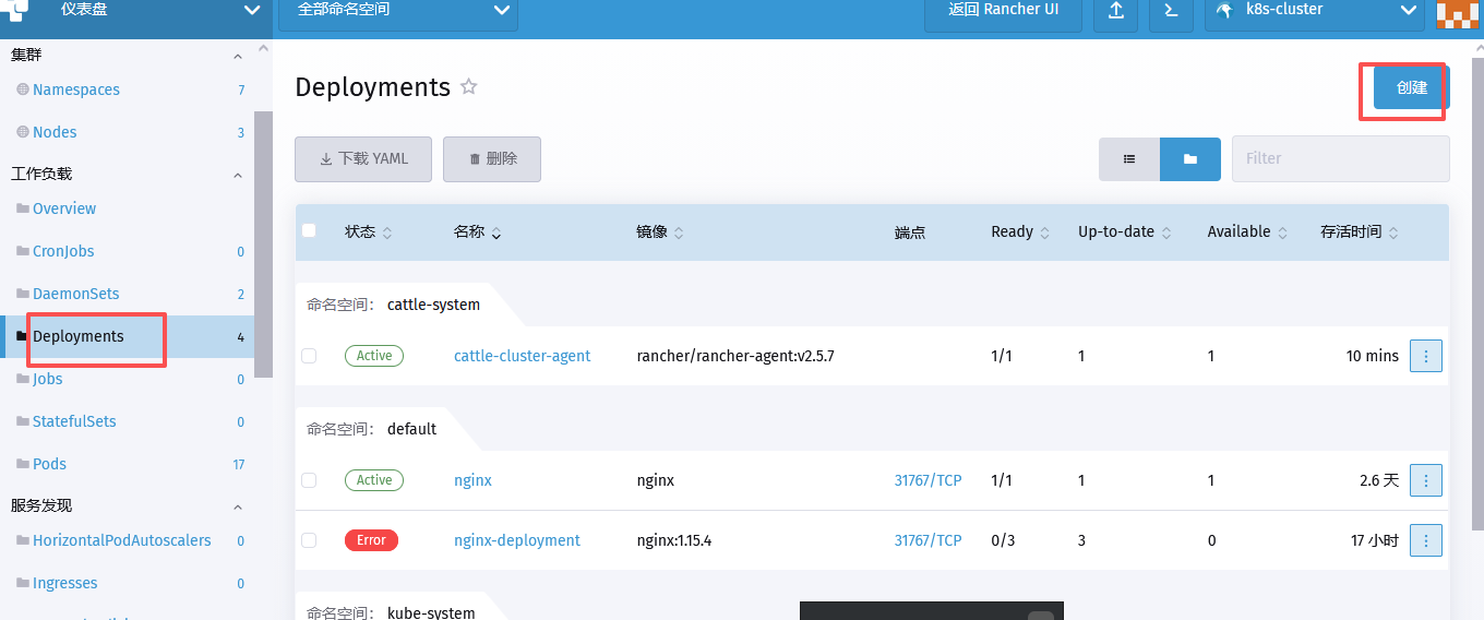 cattle-cluster-agent(位于 cattle-system 命名空间):负责与 Rancher Server 通信。