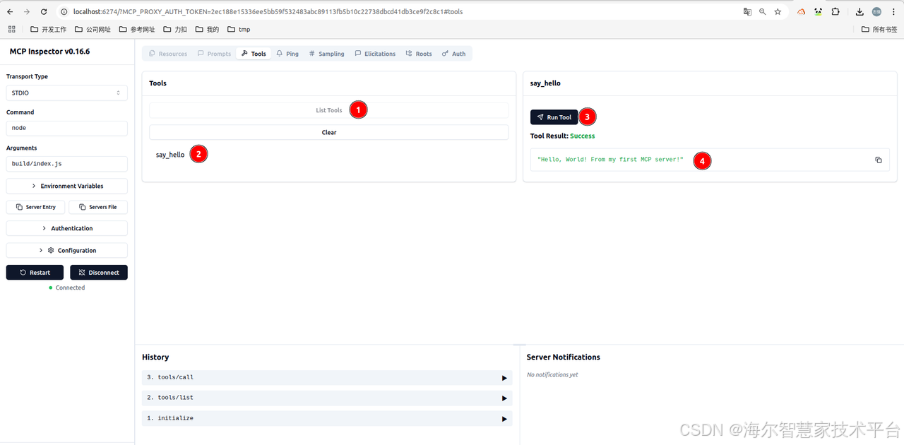 - 奇迹发生了!在右侧的 Tool Result 中,你应该能看到服务器执行成功,并返回的消息: "Hello, World! From m y first MCP server!"