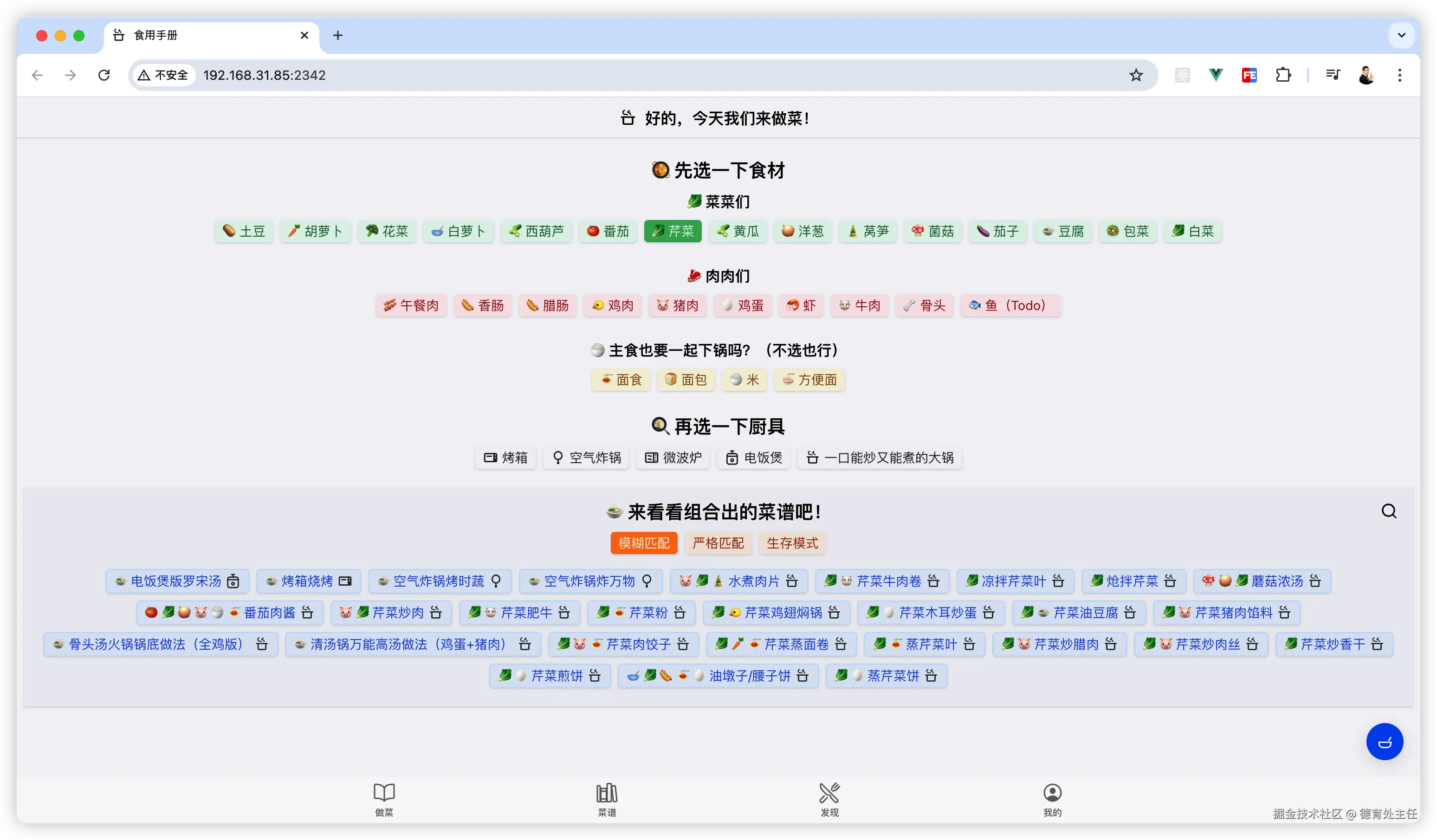 cook(来做菜)是一款适合家里食材或厨具不多时用的免费菜谱工具,选好自己有的食材和厨具就能找到适配菜谱,还能随机挑菜谱,非常适合选择困难症用户。