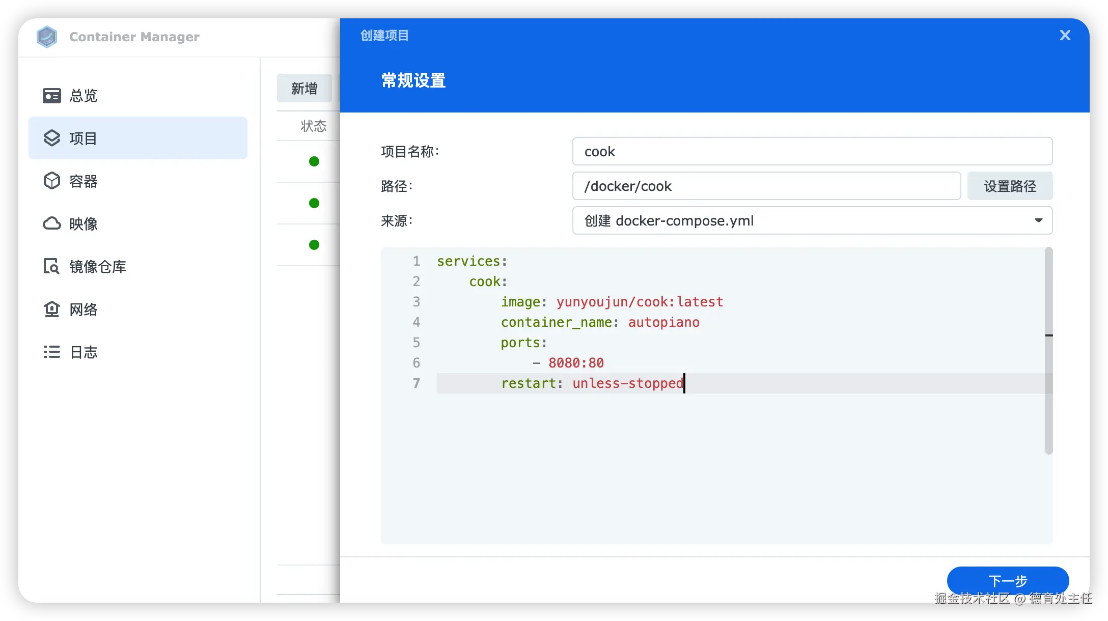 然后打开"Container Manager",新增一个项目。