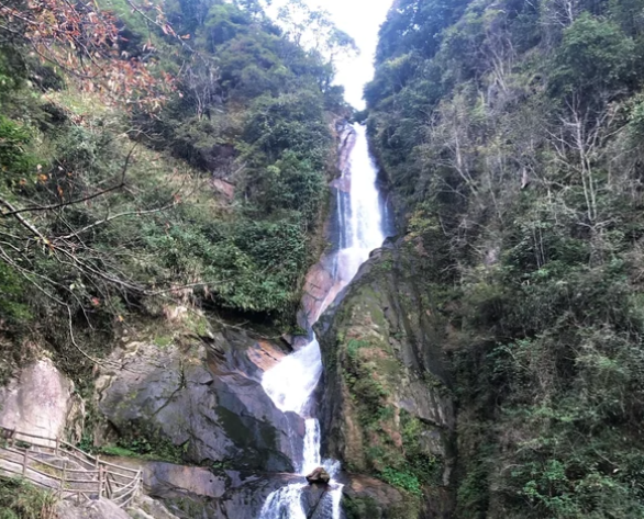 在江西省抚州市乐安县南部的群山之中,坐落着一处以瀑布群和原始森林风貌著称的景区------金竹飞瀑谷。这片区域也被称为金竹瀑布群,是国家4A级旅游景区,并曾获评"江西百景"之一。其核心景观是由大小26处瀑布组成的吓通瀑布群,总落差超过400米,构成了江西境内规模可观的瀑布群落。