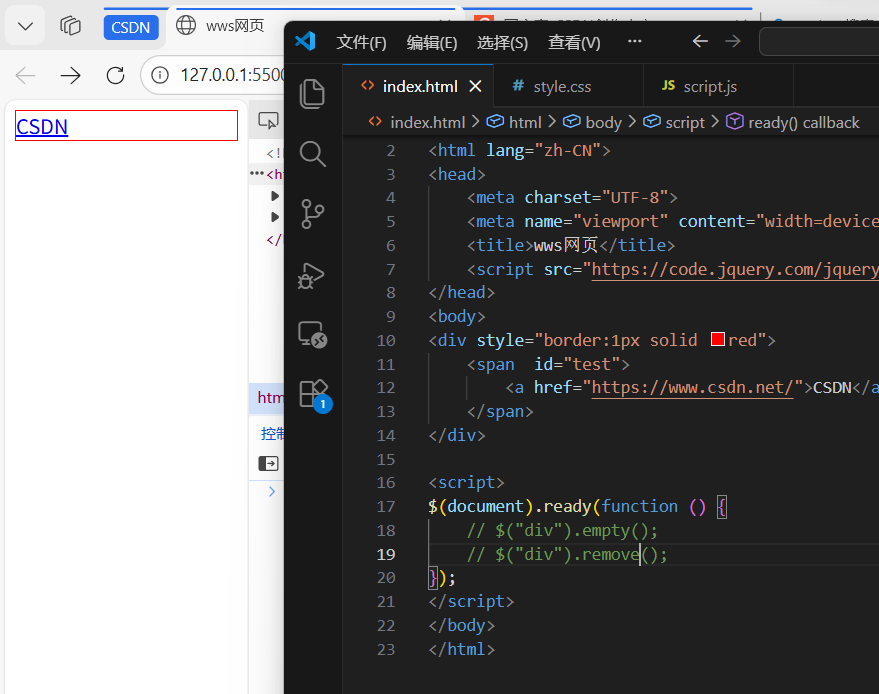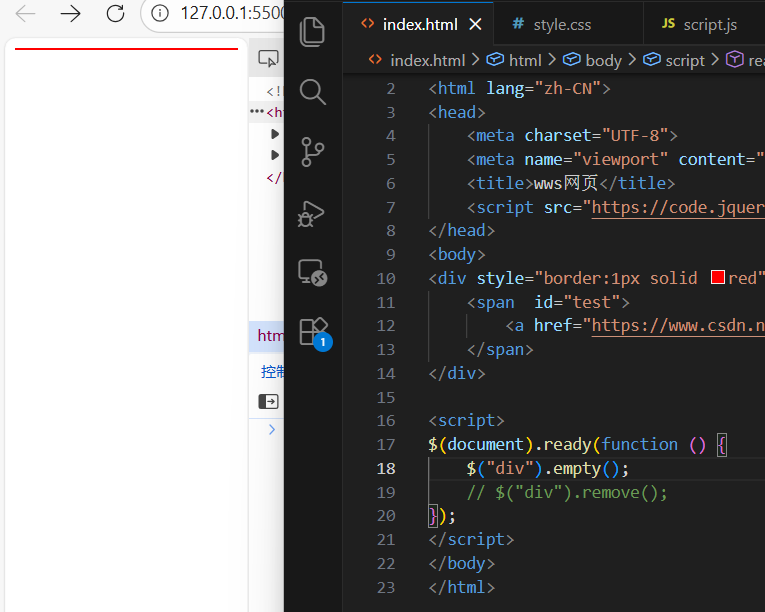 方法 作用 remove()删除 自身 + 子元素 empty()只删 子元素 empty()只删除子元素