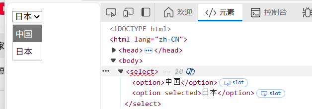 <option selected >日本</option>打开页面时:默认选中"日本"