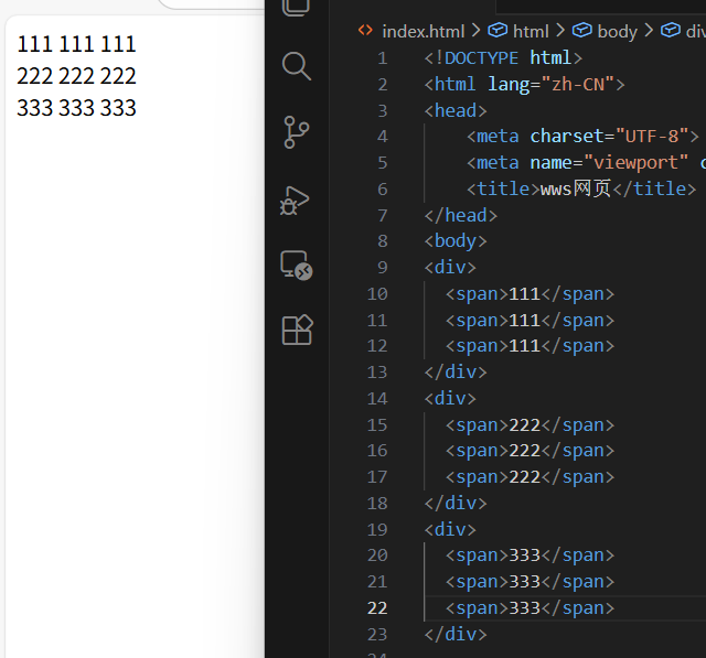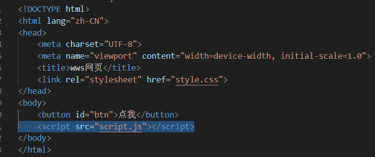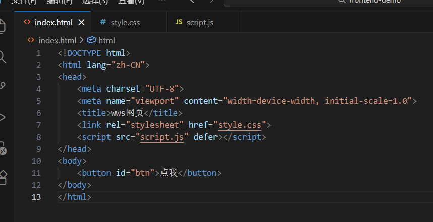 <!DOCTYPE html> //声明这是 HTML5 文档 <html lang="zh-CN"> //lang="zh-CN" 表示网页主要语言是中文 <head> <meta charset="UTF-8"> <meta name="viewport" content="width=device-width, initial-scale=1.0"> <title>wws网页</title>//网页名 </head> <body>//网页具体内容 </body> </html>!+ Tab 快捷生成