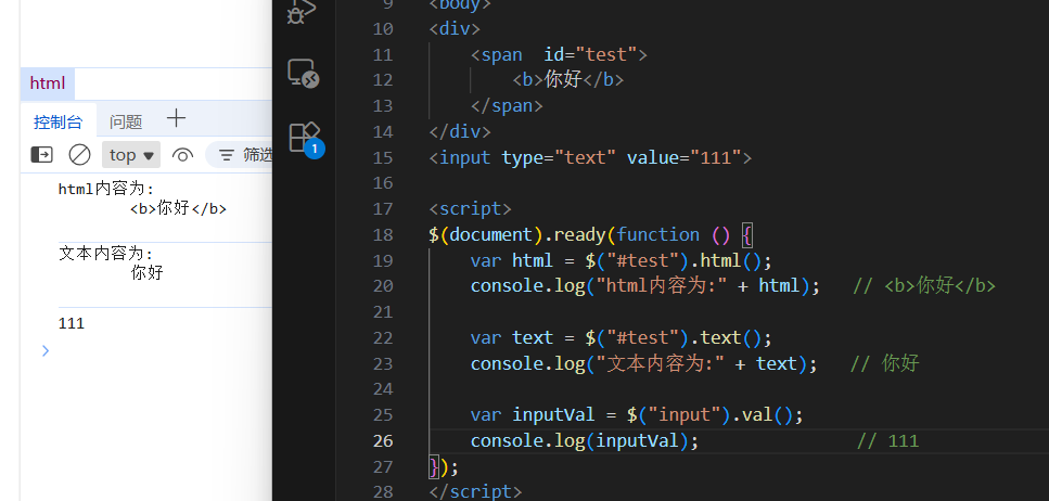 方法 作用 适用对象 text()获取 / 设置 文本内容 普通元素 html()获取 / 设置 HTML 内容(含标签) 普通元素 val()获取 / 设置 表单的值 input / select 获取元素