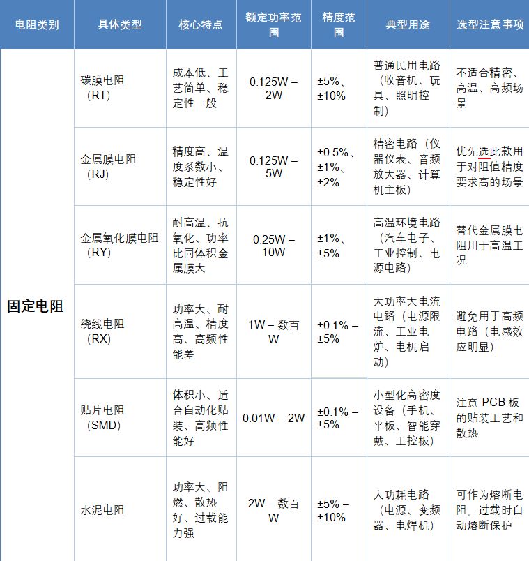 电阻是电子电路中最基础的元件之一,核心作用是限制电流、分压、分流、负载匹配 等。按阻值是否可调节 ,可分为固定电阻 和可变电阻 两大类;按材料、结构和功能,又可细分出多种特殊类型,不同类型的电阻适配不同的电路场景。