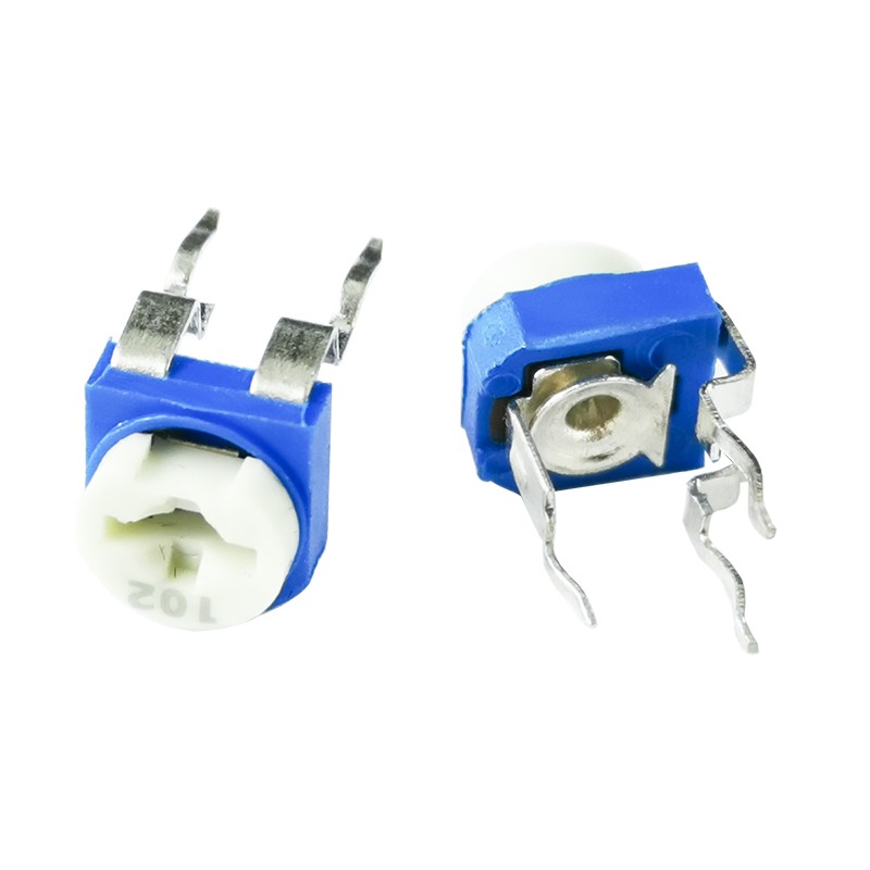 结构:小型化的可变电阻,通常有三个引脚(两个固定端 + 一个滑动端),外壳封装,配有调节旋钮。