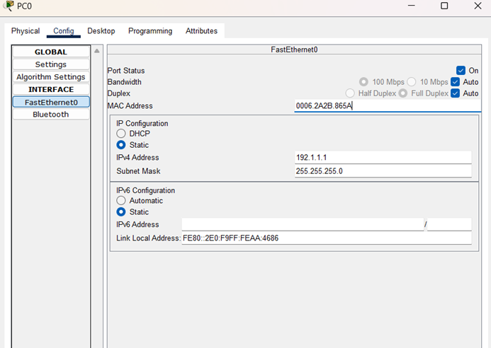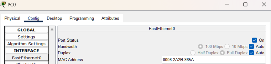 (3)在PC0 FastEthernet0接口配置界面,对PC0的MAC地址进行修改,改为0006.2A2B.865A