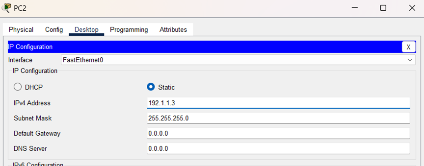 (2)对PC0、PC1和PC2的IP地址和子网掩码进行配置。