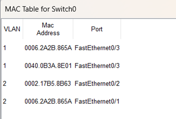 从该MAC表可以看出:VLAN2对应的MAC表中,0006.2A2B.865A对应的转发端口是Switch0连接PC0的端口f0/1,VLAN1对应的MAC表中,0006.2A2B.865A对应的转发端口是Switch0连接Switch1的端口f0/3。这表明VLAN2内终端发送给PC0的MAC帧只能到达PC0。
