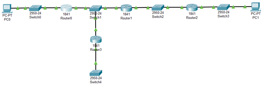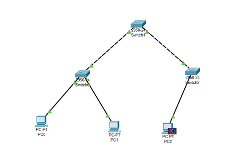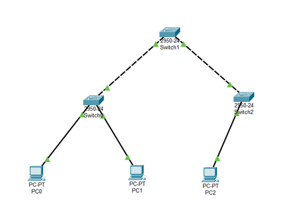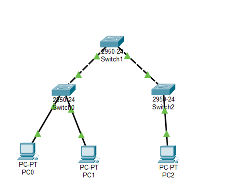 (1)在实验所用软件的逻辑工作区按照实验网络拓扑图进行设备的连接。其中终端和交换机之间用直通线互连,交换机与交换机之间用交叉线互连。