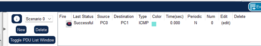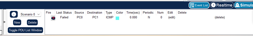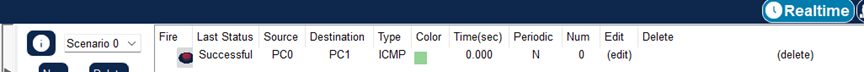 (5)在模拟操作模式下,先勾选协议ICMP。然后进行PC1至PC0的ICMP报文传输。