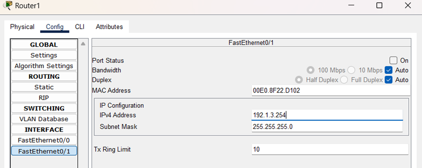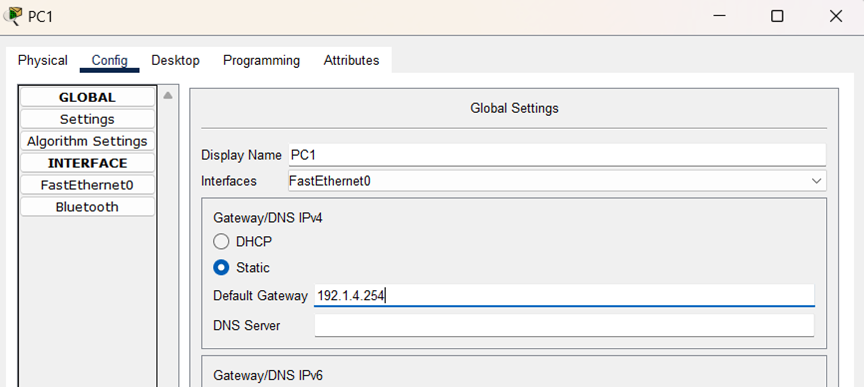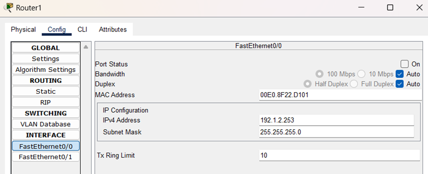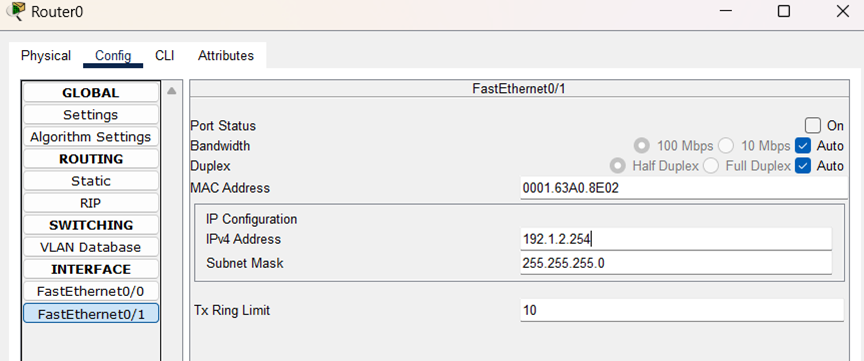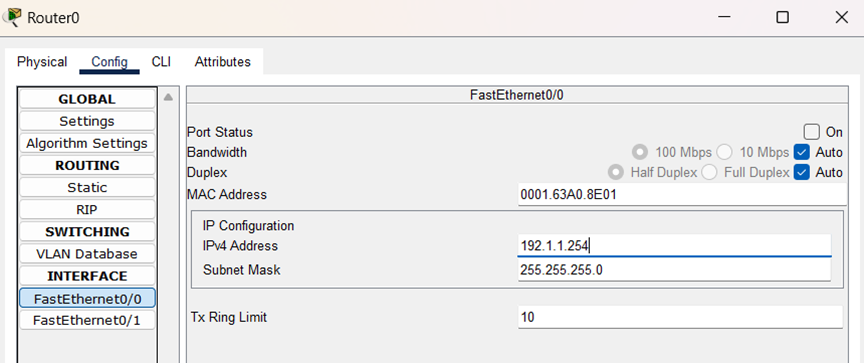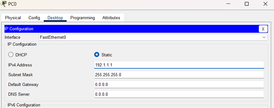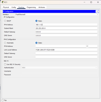 (3)配置PC0和PC1的IP地址,子网掩码和网关,结果如图所示: