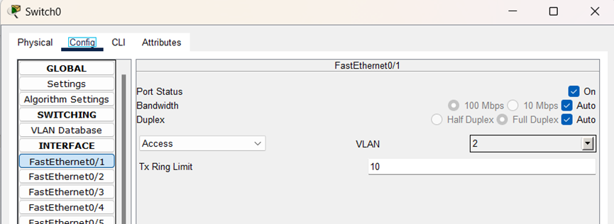 (6)在Switch0的端口f0/1配置界面中,将交换机端口f0/1作为接入端口分配给VLAN2;