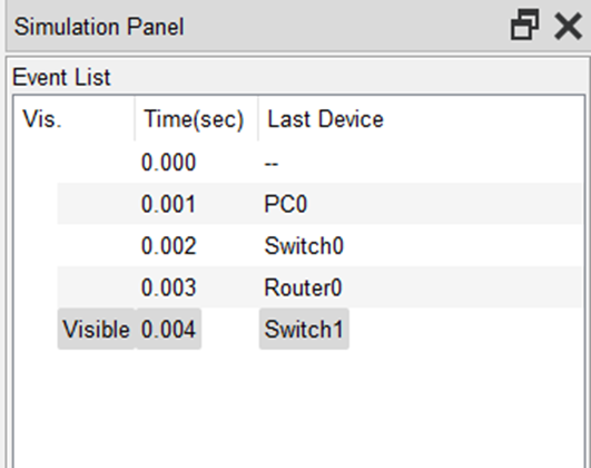 (7)进入模拟操作模式,启动PC0至PC1的IP分组传输过程,传输结果如图所示: