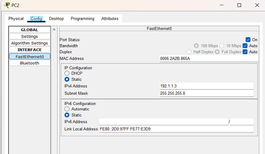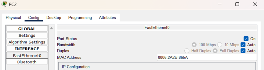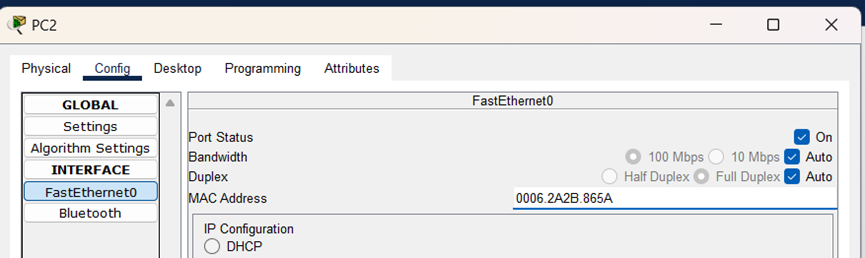 (6)在实时操作模式下,在PC2 FastEthernet0接口配置界面,对PC2的MAC地址进行修改,改为PC0的MAC地址0006.2A2B.865A