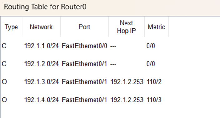 完成上述配置后,Router0的路由表如图所示: