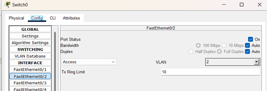 在Switch0的端口f0/2配置界面中,将交换机端口f0/2作为接入端口分配给VLAN2。