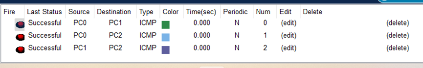 (4)完成PC0、PC1、PC2两两之间的ICMP报文传输过程。结果如图所示: