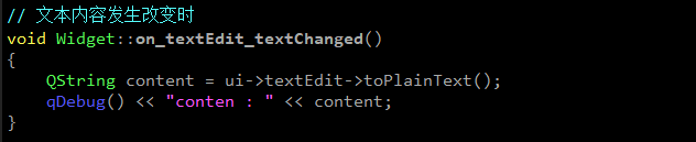 void textChanged(const QString &text) 当QLineEdit中的⽂本改变时,发出此信号,text是新的⽂本。代码对⽂本的修改能够触发这个信号.