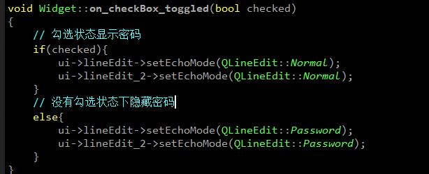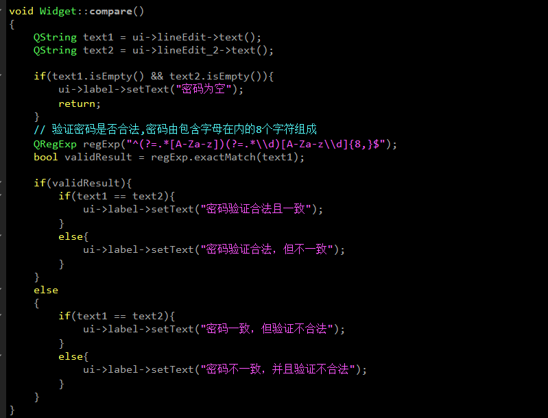 在compare函数中创建了一个QRegExp对象来验证LineEdit中的内容判断是否合法,并且比对两个LineEdit中的内容是否一致