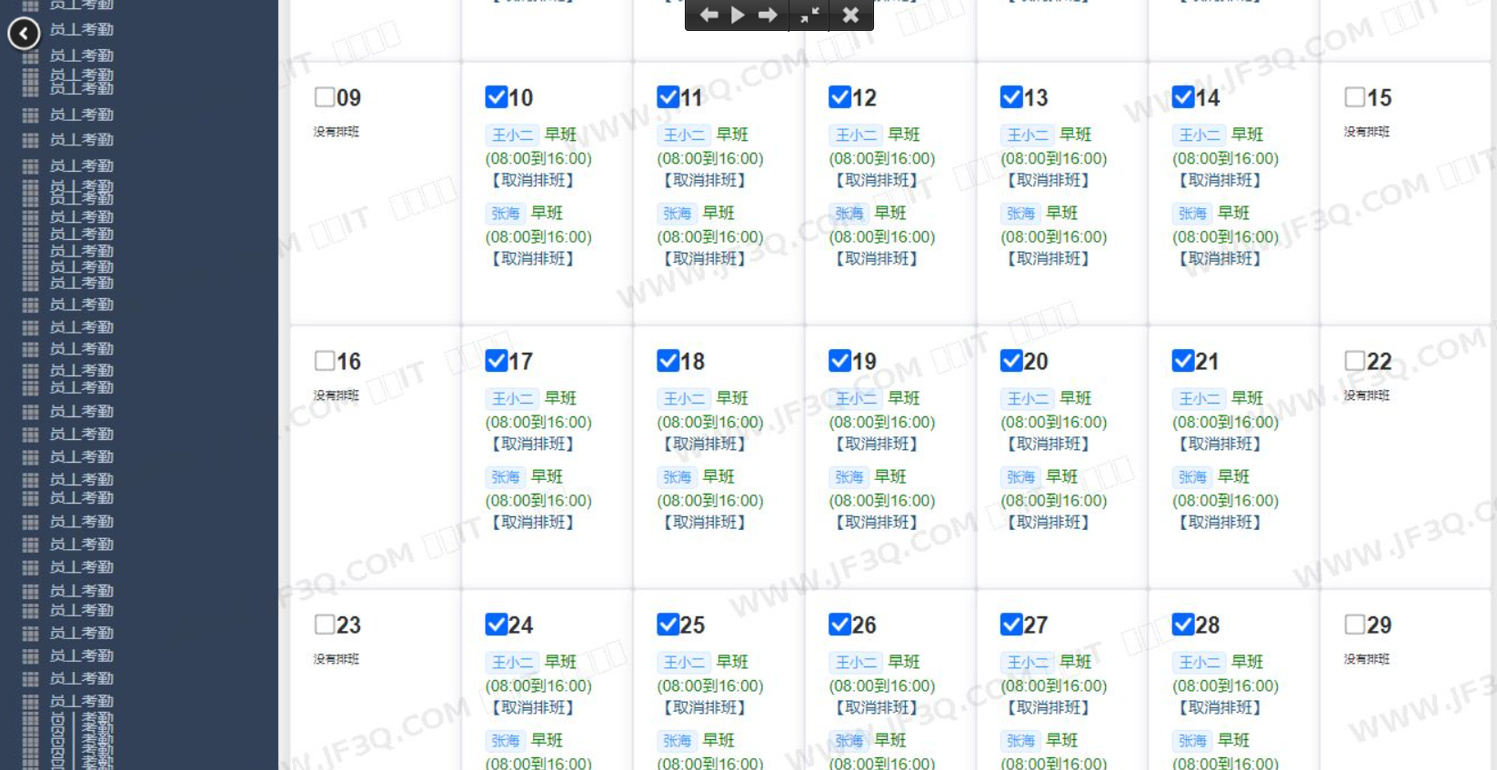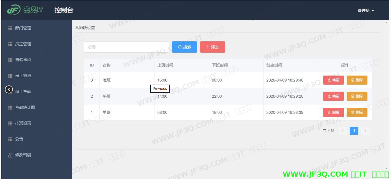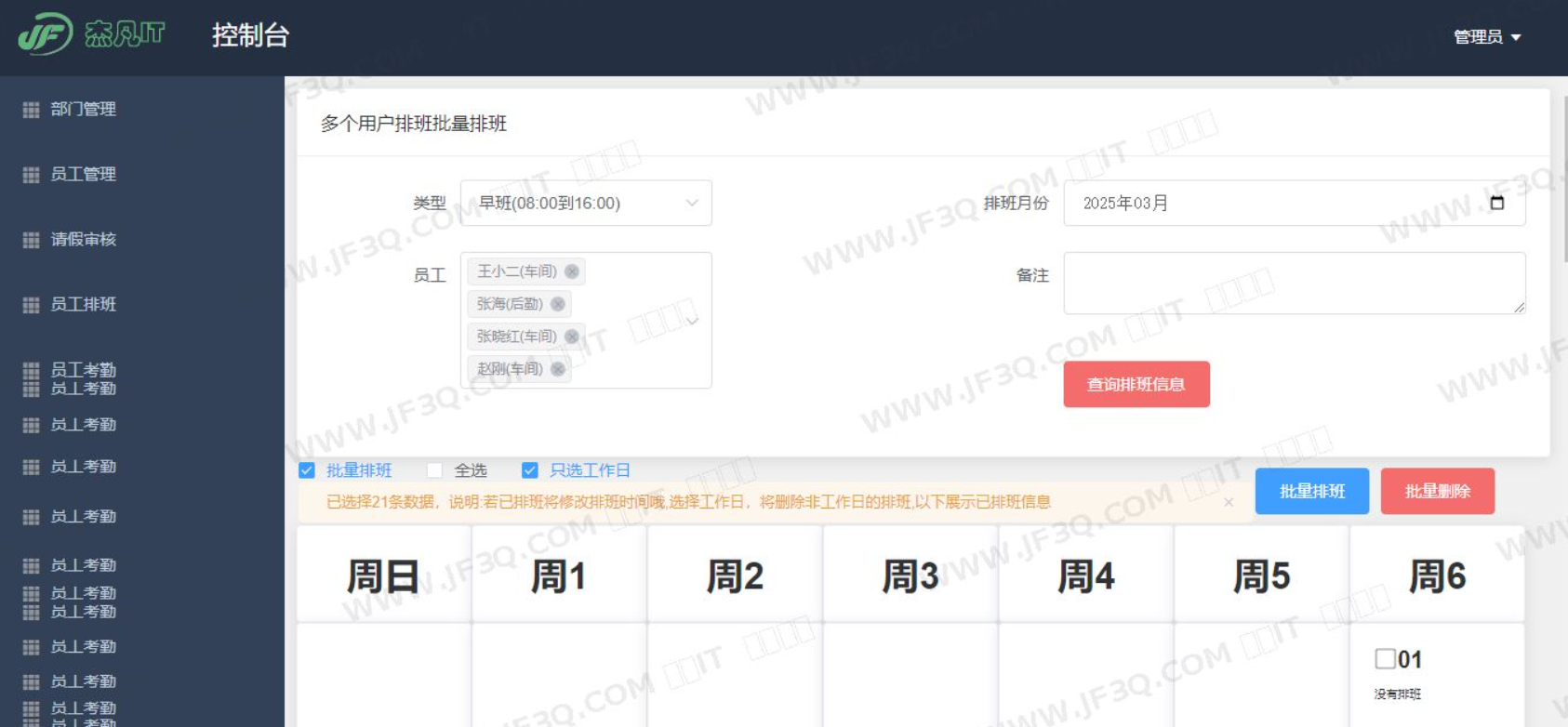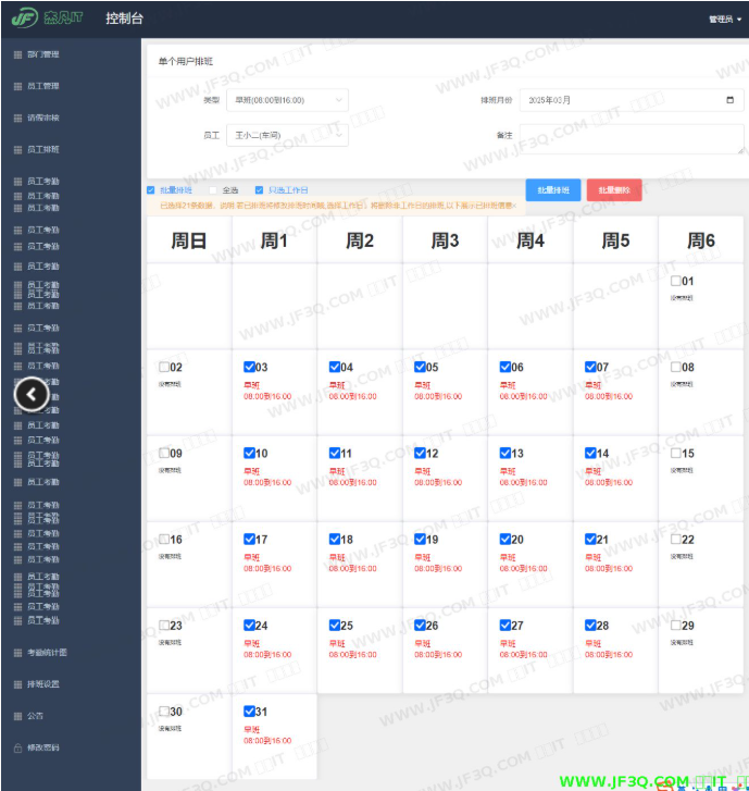 - 排班管理:定义班次时间(如早班、午班、晚班),并为员工进行批量或个性化排班。