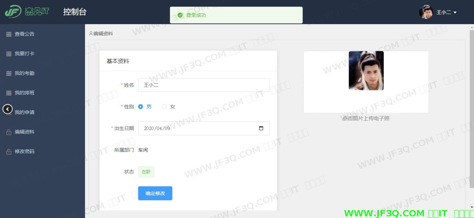 - 人脸识别打卡:通过人脸识别技术进行每日上下班打卡,系统自动记录打卡时间及状态(正常、迟到、早退)。