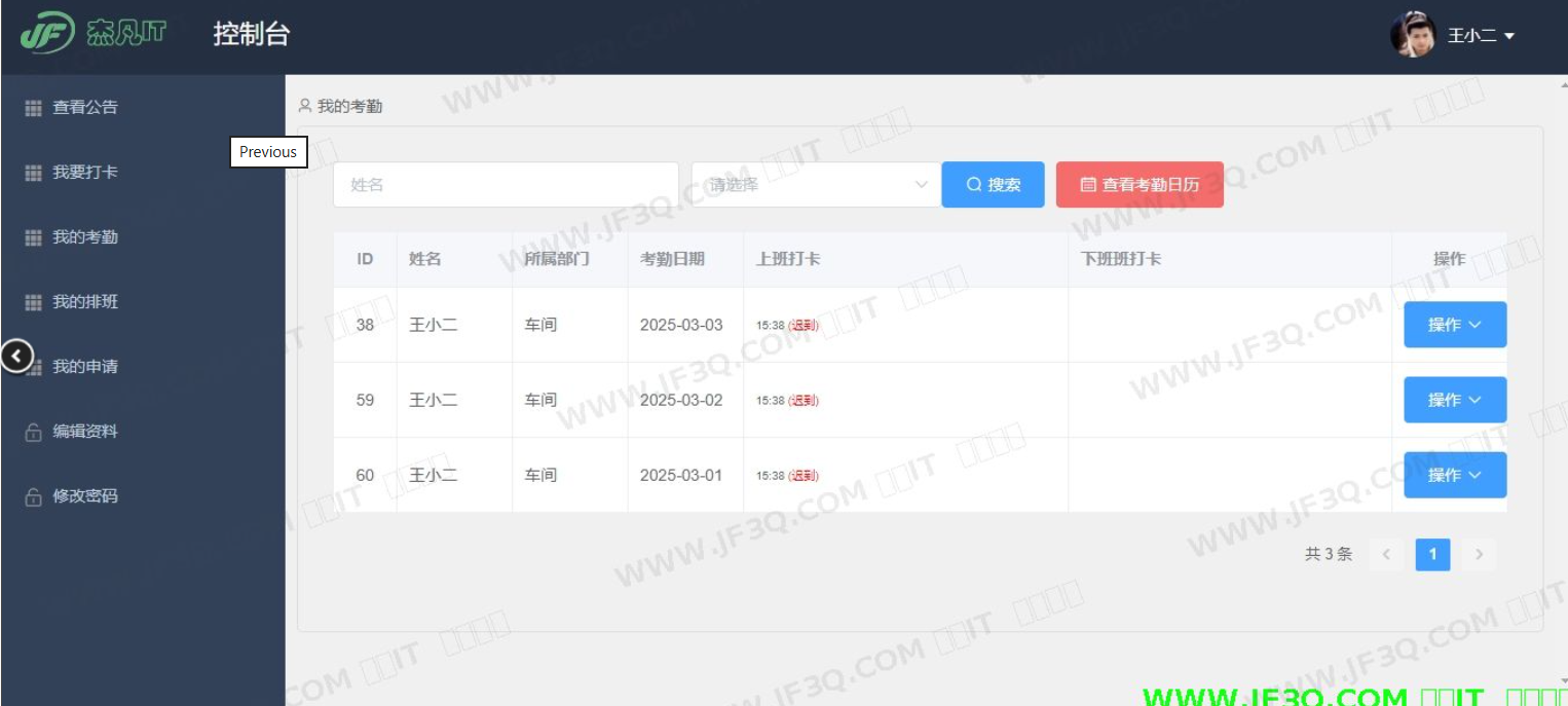 - 考勤记录查看:查询个人的历史考勤明细及统计报表。