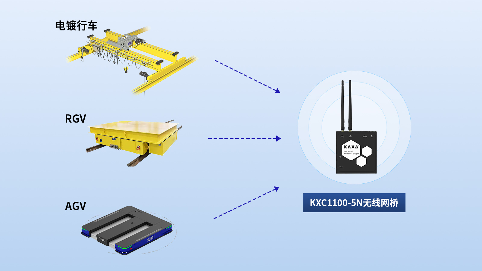 同时,AGV、电镀行车等移动设备将部署KXC1100-5N工业无线网桥,保障移动过程中的持续稳定通信。